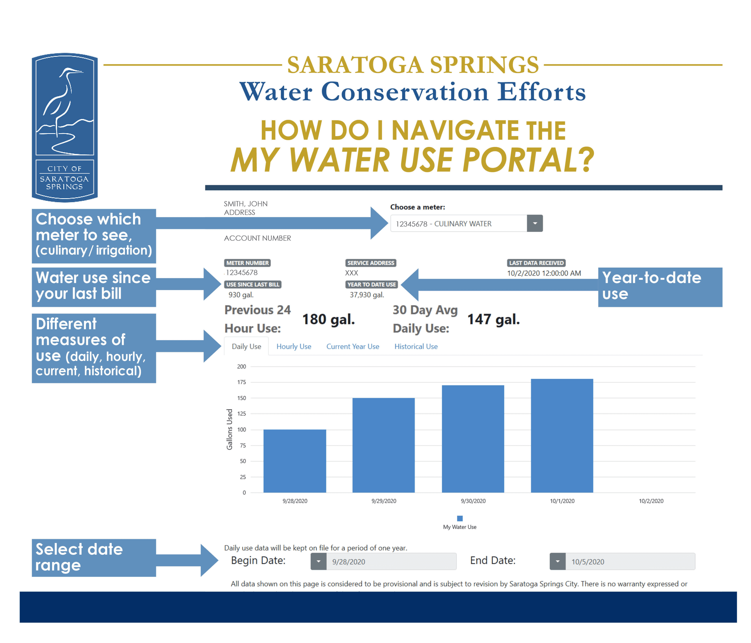 Saratoga Springs uses a customer portal that allows residents to see their hourly water usage and make monthly and yearly comparisons for both their secondary and culinary systems. These materials explain how to use the portal.